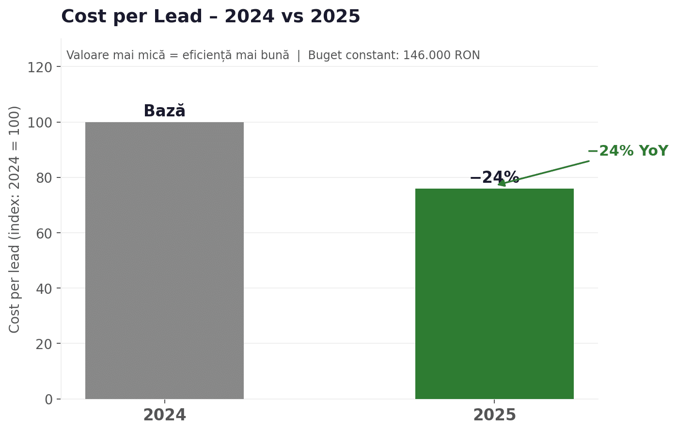 Un producător de bucătării la comandă genera lead-uri, dar prea puține se transformau în programări reale la showroom. Costul per lead era ridicat, rata de închidere slabă – și totuși bugetul de marketing rămânea neschimbat. În loc să cheltuim mai mult, am ales să cheltuim mai bine. Rezultat: +54% programări YoY și −24% cost per lead, cu același buget de 146.000 RON.
